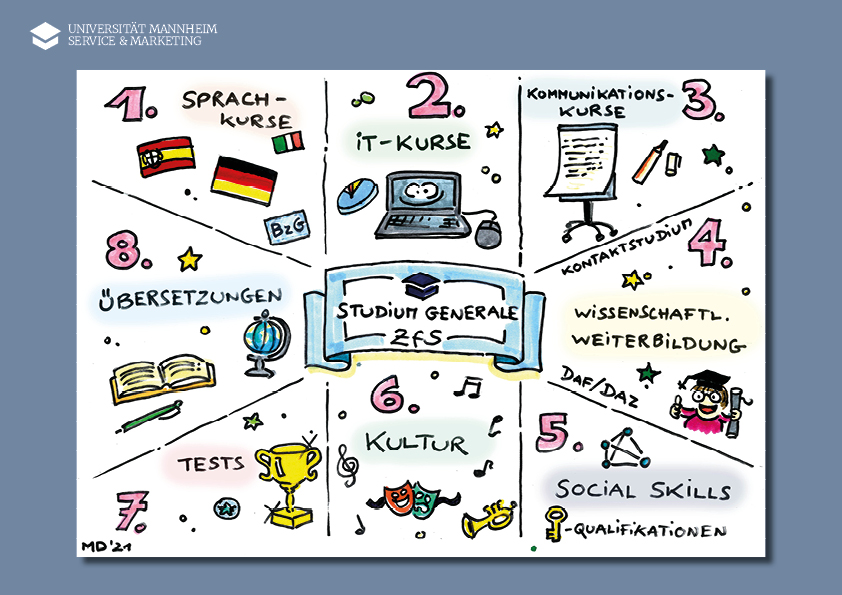 Anmeldungen sind immer bis 6 Tage vor Kursbeginn online möglich! Danach gerne per Mail: studiumgenerale@service.uni-mannheim.de.